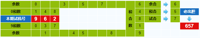 本期3d试机号开出的号码是962,胆码计算器开出的号码是657,重合了一个6号球。结合近期试机号命中开奖号走势图来看,近期试机号的命中率不算太低。在连续命中两期后上期空缺,本期看好试机号势态回升,建议留意试机号给出的三码。重合的8号球近期有较大的升温潜力,建议着重关注。