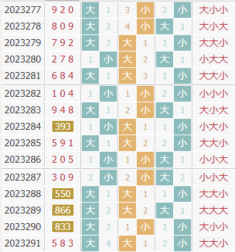 上期开出了号码583,组六类型,奇偶奇,大大小形态,和值16,跨度5,近10期里全大开出了1期,2大1小开出了4期,1大2小开出了4期,全小开出了1期,大数小数开出持平,但是走势上近5期是大数走热,预计大数会继续开出,本期关注大数。