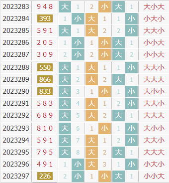 上期开出了号码226,组三类型,偶偶偶,小小大形态,和值10,跨度4,在大小走势上,近10期出现0次全小,3次全大,3次两大一小,4次两小一大,大数占比更多,但是走势上近5期是小数走热,预计小数会继续开出,本期关注小数。