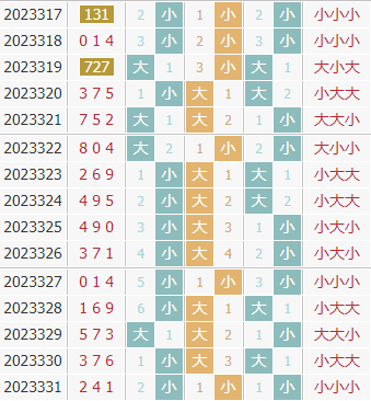 上期开出了号码241,组六类型,偶偶奇,小小小形态,和值7,跨度3。近10期里全大开出了0期,2大1小开出了5期,1大2小开出了3期,全小开出了2期,大小占比持平,走势上近5期是大数走热,预计小数会反击开出,本期关注小数。