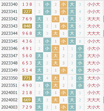 上期开出了号码729,组六类型,奇偶奇,大小大形态,和值18,跨度7。近10期里全大开出了1期,2大1小开出了4期,1大2小开出了5期,全小开出了0期,大小占比是持平的,但是走势上数量上是大数走势热,预计大数会继续开出,本期关注大数。