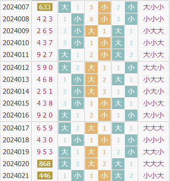 上期开出了号码446,组三类型,偶偶偶,小小大形态,和值14,跨度2。在大小走势上,近10期里全大开出了2期,2大1小开出了3期,1大2小开出了4期,全小开出了1期,大数数量开出更多,走势上近期也是大数走热,预计大数会继续开出,本期关注大数。