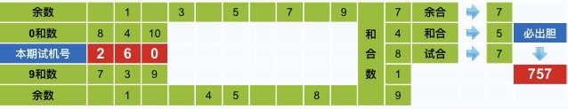 本期3d试机号开出的号码是260,胆码计算器开出的号码是757,没有重合的号码。结合近期试机号命中开奖号走势图来看,近期试机号的命中率还有很大的提升空间,近期命中几率不高,但上期命中,势态有所好转,本期建议适当关注试机号三码。