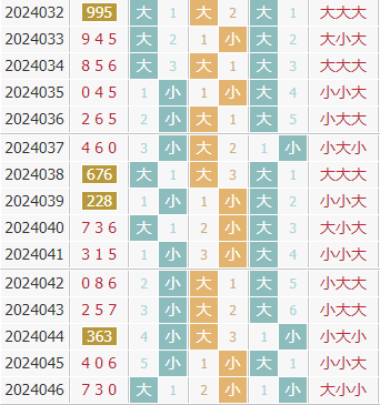 上期开出了号码730,组六类型,奇奇偶,大小小形态,和值10,跨度7。在大小走势上,近10期里全大开出了1期,2大1小开出了3期,1大2小开出了6期,全小开出了0期,小数占比更多,但是走势上近期是小数走热,预计小数会继续开出,本期关注小数。
