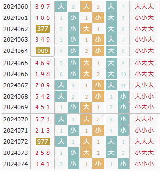 上期开出了号码041,组六类型,偶偶奇,小小小形态,和值5,跨度4。在大小走势上,近10期里全大开出了1期,2大1小开出了5期,1大2小开出了2期,全小开出了2期,大号更具优势,但是近期小号的提升较为明显,本期重点关注小号。