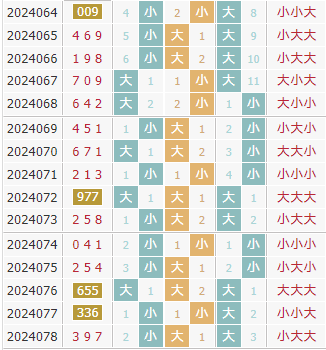 上期开出了号码397,组六类型,奇奇奇,小大大形态,和值19,跨度6。在大小走势上,近10期里全大开出了2期,2大1小开出了3期,1大2小开出了3期,全小开出了2期,大号和小号在势态上没有明显的落差,进四期号码大小号交替占优,本期看好在转为小号优势的号码。