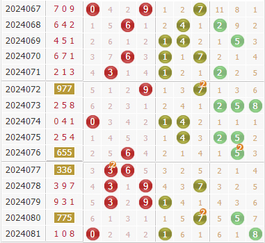 个位上近10期012路比为1:5:4,从数据上2路占优,0路的空缺多,但近期三路游走现象比较明显,本期看好0路反转,本期重点关注0路。