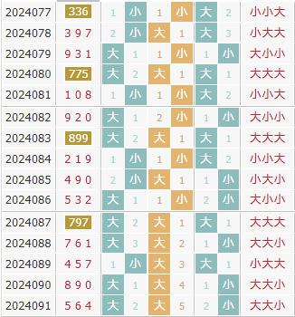 上期开出了号码564,组六类型,奇偶偶,大大小形态,和值15,跨度2。在大小走势上,近10期里全大开出了2期,2大1小开出了4期,1大2小开出了4期,全小开出了0期,大号近期增长迅猛,两大一小形态连续四期开出,但这种局面下小号具有较大的反升空间,本期应适当留意一大两小的反弹。
