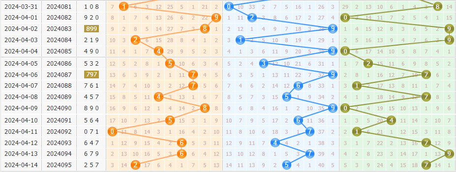 个位出7号,近5期奖号分别遗漏15-3-3-9-1,近5期个位出号间隔偏低,由此可见温热号码的势态是非常好的,本期建议留意温号1的开出。