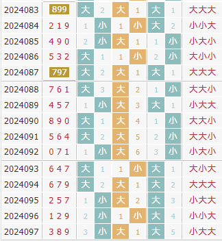 上期开出了号码389,组六类型,奇偶奇,小大大形态,和值20,跨度6。在大小走势上,近10期里全大开出了1期,2大1小开出了7期,1大2小开出了2期,全小开出了0期,大号出号迅猛,不仅全大出现频率很高,而且两大一小开出比例非常大。