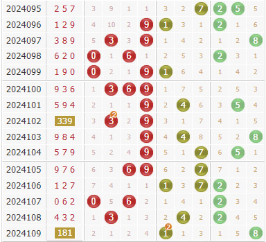 个位上近10期012路比为4:4:2,从数据上看,1路增长速度比较快,近几期2路出号密度也在上升,本期重点关注2路。