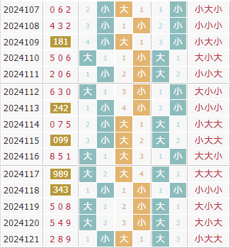 上期开出了号码289,组六类型,偶偶奇,小大大形态,和值19,跨度7。在大小走势上,近10期里全大开出了1期,2大1小开出了6期,1大2小开出了1期,全小开出了2期,近期大号升温十分迅猛,小号有巨大的回升空间。