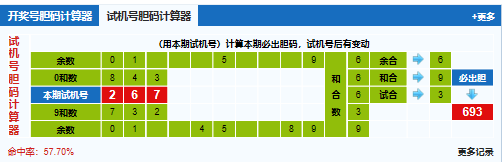 本期试机号开出的类型为组六,胆码计算器给出的类型组六,类型一致。上期开出的号码为组三类型,本期看好组六开出。