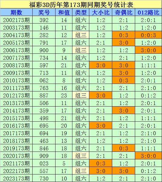 012路分析:在第173期历史同期开奖中,奖号012路个数总比例为33:17:16,奖号012路轮空期数比为3:9:10,今年同期注意0路号码走冷轮空,关注012路比为0:1:2。