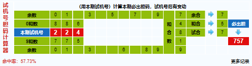 本期3d试机号开出的号码是224,胆码计算器开出的号码是757,2号球是上期开奖号码,查看走势图,此前2号球有连开的历史数据,本期看好2号球的开出,4号球上期未开出,本期4号球是规律号球,本期可关注4号球的开出,7号球目前遗漏了6期,近期近期呈冷态趋势,本期不看好7号球的开出。