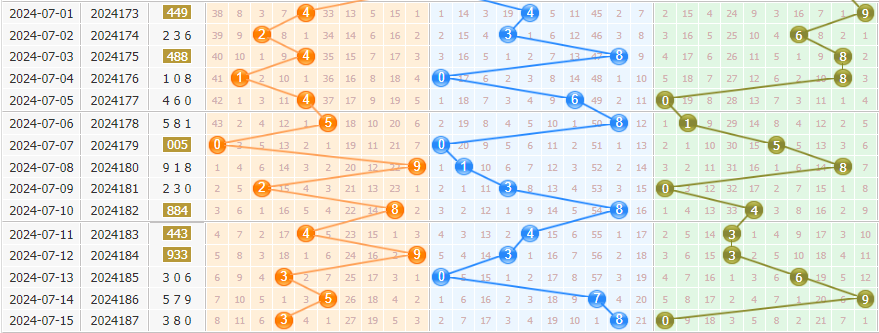 十位出8号,近5期奖号分别遗漏9-2-5-57-4,有高遗漏号码的记录,但总体间隔偏小,本期建议关注热号3。