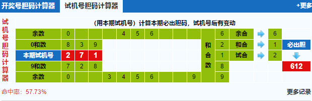 结合试机号胆码计算器来看,6号球近期明显升温,看好6号球的同间隔开出;1号球上期刚刚开出,近期复码开出增强,继续看好1号球的出号;2号球就是冷号,不过冷号都在陆续回暖,继续看好2号球的表现。