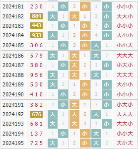 上期开出了号码725,组六类型,奇偶奇,大小大形态,和值14,跨度5。在大小走势上,近10期里全大开出了3期,2大1小开出了2期,1大2小开出了4期,全小开出了1期。近期大小势态趋于平衡,本期关注一大两小。