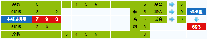 本期3d试机号开出的号码是798,胆码计算器开出的号码是693,重合了一个9号球。结合近期试机号命中开奖号走势图来看,近期同时命中两个试机号的情况比较多见,试机号势态保持平稳。重合的7号球为近期升温号码,本期建议继续关注。