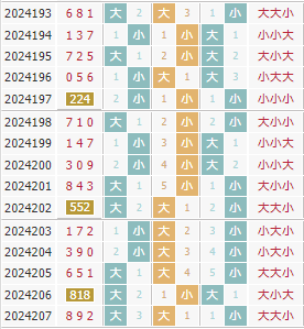 上期开出了号码892,组六类型,偶奇偶,大大小形态,和值19,跨度7。在大小走势上,近10期里全大开出了0期,2大1小开出了4期,1大2小开出了6期,全小开出了0期。近期由小号占优转为大号占优,目前两大一小连续开出三期。