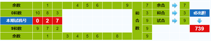 本期3d试机号开出的号码是027,胆码计算器开出的号码是739,重合了一个7号球。结合近期试机号命中开奖号走势图来看,近期试机号命中几率保持较高的水平,目前连续命中两期,本期试机号继续命中的可能性很大,建议着重关注重合的7号球。
