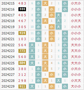 上期开出了号码911,组三类型,奇奇奇,大小小形态,和值11,跨度8。在大小走势上,近10期里全大开出了0期,2大1小开出了5期,1大2小开出了2期,全小开出了3期。近五期小号出现反升,近期小号占优的组合需要着重留意。