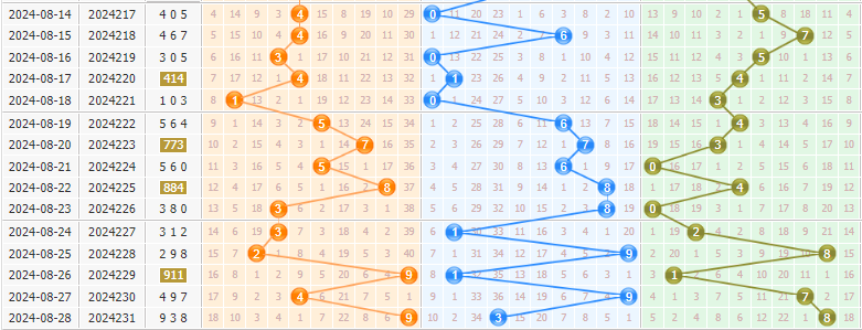 个位出4号,近5期奖号分别遗漏19-21-20-11-2,冷号占比较大,剩余冷号不多,近期温号势头占优,本期建议关注温号4。