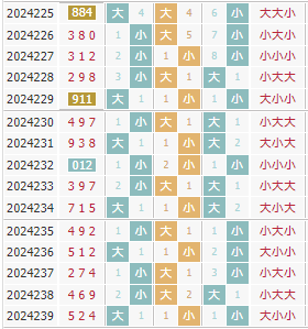 上期开出了号码524,组六类型,奇偶偶,大小小形态,和值11,跨度3。在大小走势上,近10期里全大开出了0期,2大1小开出了5期,1大2小开出了4期,全小开出了1期。近十期由大号占优逐渐转为小号占优,留意大号再次发力。