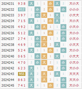上期开出了号码741,组六类型,奇偶奇,大小小形态,和值12,跨度6。在大小走势上,近10期里全大开出了1期,2大1小开出了3期,1大2小开出了6期,全小开出了0期。近期大号和小号势态逐渐拉平。