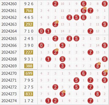 冷热温分析:上期开出了号码172,组六类型,奇奇偶、小大小形态,和值10,跨度6。上期开出了两个隔期号,在近期的出号中,隔期号出现的频率大幅提升,本期仍有两个待开隔期号,本期建议重点关注这两个隔期号。