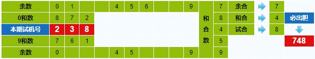 本期3d试机号开出的号码是238,胆码计算器开出的号码是748,重合了一个8号球。结合近期试机号命中开奖号走势图来看,近期试机号的命中几率比较有上升的趋势,近三期命中了两期,本期看好试机号提升,重合的8号球为近期冷号,本期看好8号球破冰开出。