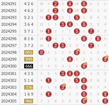 组选号码012路比为29:22:36,其中0路号码轮空4期,1路号码轮空7期,2路号码轮空2期,本期012路比参考3:0:0组合。