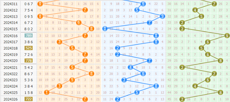 号码0-9出现开出频次分别为:号码2、3、4、7、8、9出现8次,号码5、6出现6次,号码0出现5次,号码1出现4次。一般来说,表现最冷的三码:0、1、6不会同时出现,本期杀一码:6;表现最热的四码:2、3、4、7中一般会出现奖号,本期注意号码;3。