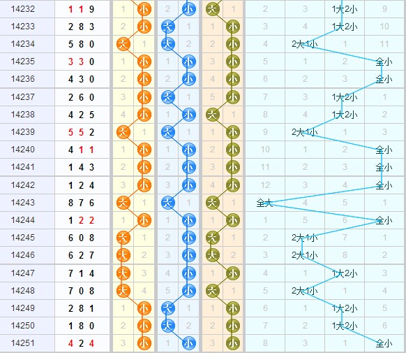从3d之家3d大小走势图来看,上期开出小小小,近三期均以小号为主,百位上期开出小号球,本期百位看好大号球,十位上期开出小号球,结合走势图,本期看好小号球,个位上期开出小号球,本期个位重点关注大号球,本期综合推荐大小形态大小大,大大大。