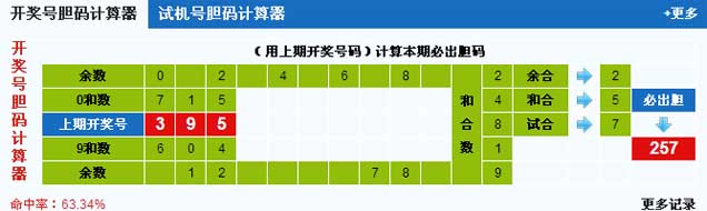 从上图中可以看到胆码计算器的命中率达到了63.34%,可见预测胆码命中的几率还是很高的。本期胆码计算器预测必出胆257,结合走势图,苏会文看好2号球和5号球。其中2号球已经遗漏了11期未开出,本期可进行防守。而5号球上期有开出,本期有望继续开出。