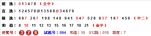 上期的开奖结果是370,组六组合,小大小,奇奇偶,和值是10,跨度为7,012路号码为010。