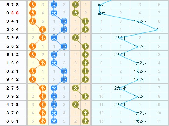 结合3d之家3d大小走势图来看,上期开出小大小,本期看好开出两大一小形态,百位上期开出小号球,本期大号球有回补的趋势,可以防守,十位上期开出大号球,本期十位依旧关注大号球的开出,个位上期开出小号球,本期个位看好大号球的开出防小号球,本期大小形态关注小大大,大大小。