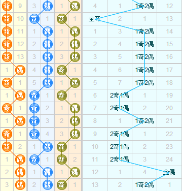 根据奇偶走势图分析,从整体上来看,近15期内奇数开出21次,偶数开出24次,偶数出号走势较强。百位上前期奇数为主,后期以偶数为主。十位上前期以偶数为主,后期以奇数为主。个位上偶数走势比较强。结合百十个位上走势,本期奇偶形态推荐:偶偶奇、奇偶奇。