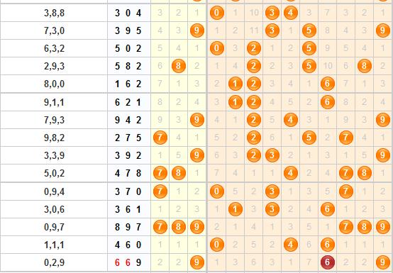 通过上面的福彩3D综合走势图可以看出,近10期内由于上期开出了669,使得号码6、9开始转温,这10期中号码2、6、7、9较热;号码3、4开始转温;号码0、5、8都比较冷。