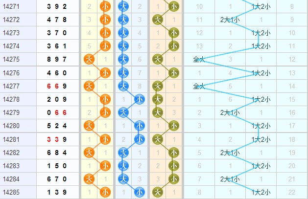 结合3d之家3d大小走势图,上期大小形态开出小小大,百位上期开出小号球,本期百位继续看好大号球的开出,十位上期开出小号球,本期十位看好大号球,个位上期开出大号球,本期个位小号球有继续走冷的趋势,本期个位看好大号球防小号球,本期大小形态看好小大大,大大小。