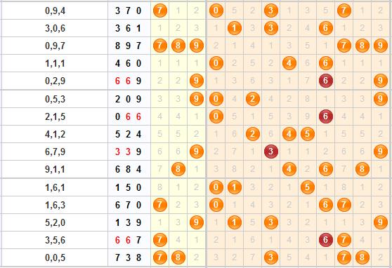 通过上面的福彩3D综合走势图可以看出,近10期内由于上期开出了738,使得号码3跟7开始转温,这10期中号码0、6较热;号码3、7开始转温;号码2、4都比较冷。