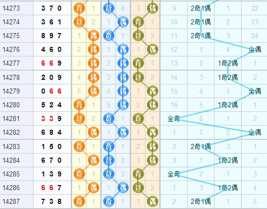 结合3d之家3d奇偶走势图,上期大小形态开出奇奇偶,上期百位开出奇数号,本期百位看好偶数号,十位上期开出奇数号,本期十位看好奇数号球,个位上期开出偶数号,个位偶数号球近期有回暖的趋势,本期个位看好偶数号球的开出,本期奇偶形态看好奇奇偶、奇偶偶。