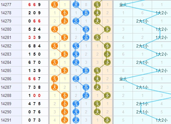 从3d之家大小走势图来看,上期大小形态开出大大小,上期百位开出小号球,近期小号球走热,本期百位看好小号球的开出,十位连续三期开出大号球,本期十位看好大号球的开出,上期个位开出小号球,本期个位看好小号球防大号球,本期舍利子专家大小形态综合推荐小大小、小大大。
