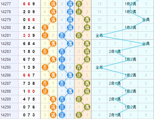 结合3d之家3d奇偶走势图,上期奇偶形态开出偶奇奇,上期百位开出偶数号,本期百位看好偶数号,十位上期开出奇数号,本期十位看好偶数号,个位上期开出奇数号,本期个位看好偶数号球防奇数号球,本期奇偶形态看好偶偶偶、偶偶奇。