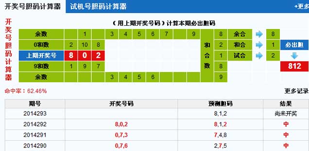 从上图中可以看到胆码计算器的命中率达到了62.49%,可见预测胆码命中的几率还是很高的。而且前面连续三期胆码计算器预测的胆码都有中,相信本期中的可能性也很高。本期胆码计算器预测必出胆812。其中2号球和8号球上期均有开出,本期有望继续开出。而1号球也已经有4期没有开出了,本期可以重点关注一下。