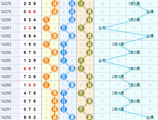 结合3d之家3d奇偶走势图,上期奇偶形态开出偶偶偶,上期百位开出偶数号,近期百位偶数号持续走热,本期百位依旧看好偶数号,十位上期开出偶数号,本期十位看好奇数号,个位上期开出偶数号,本期个位看好奇数号球防偶数号球,本期奇偶形态看好偶偶奇、偶奇奇。