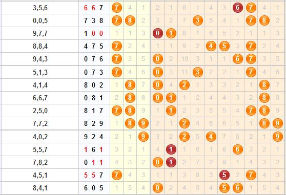 和值趋势分析:上期和值开出了11,开在了中间区域段内,本期的和值变化应该不会太大,应该也是开在在附近,主要关注和值10-18之间的和数点。