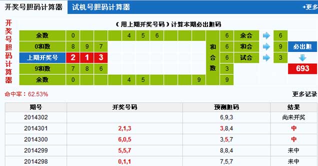 从上图中可以看到胆码计算器的命中率达到了62.53%,可见预测胆码命中的几率是挺高的。前面连续两期预测胆码都有中,预计本期预测的胆码命中的可能性很高。本期开奖号胆码计算器预测必出胆693。其中3号球上期有开出,本期有望继续开出。9号球近期的走势比较冷,已经有5期没有开出了,本期可重点关注一下。