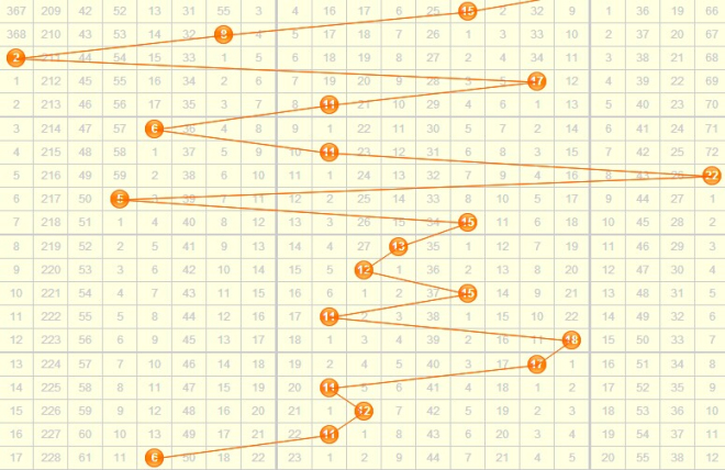 上期开出和值6,和值6近期比较冷,结合走势图,前10期的波动幅度较小。上一期来了个大变动,开出了冷号和值6,根据以往的和值分布图看,这一期将由各大跨度,本期基友可能开出和值11-18范围之间。本期和值看好8-18,本期重点看好和值11、12、13、15、17。