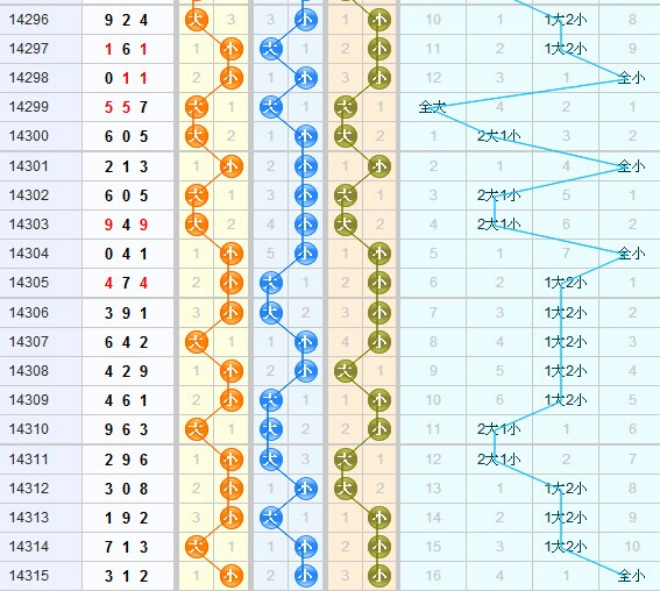 上期大小形态开出小小小,根据以往的大小走势分布,大小形态全小开出后悔间隔几期才会开出,本期不可能再开出全小。本期看好2大1小大小形态的开出。观察百十个位上大小的分布,百位上开出小号求的概率较大,十位上开出大号球,个位上开出大号球。本期综合推荐小大大防大大小。